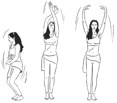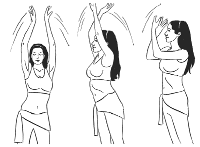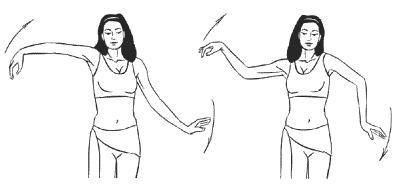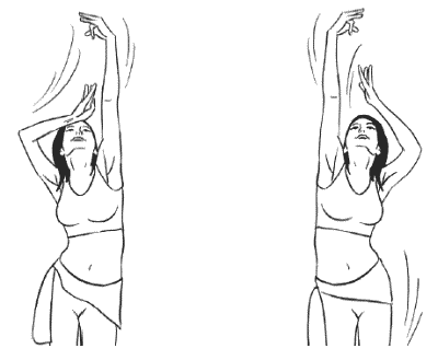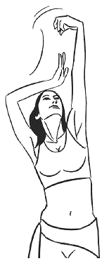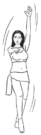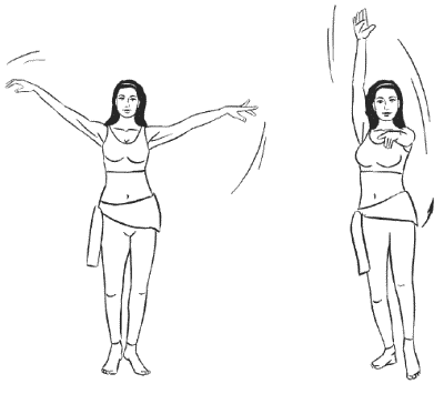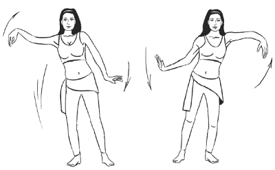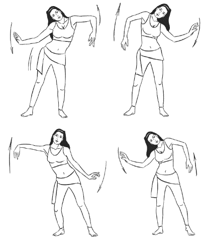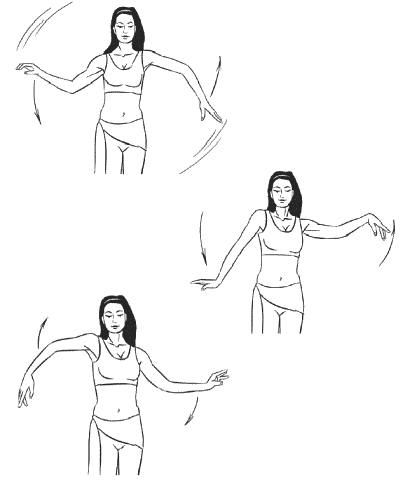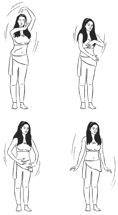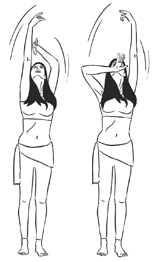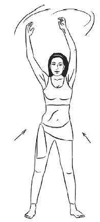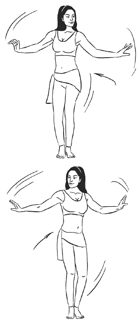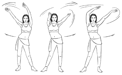 30. К предыдущему непрерывному большому вращению бедер добавьте круговые вращения руками над головой. Движение рук начинается в сторону движения бедер. В этом упражнении очень важно сочетать равномерный ритм вращения рук и бедер. Не допускайте, чтобы руки или бедра двигались быстрее. Сначала выполните 20 плавных вращений вправо, затем влево.