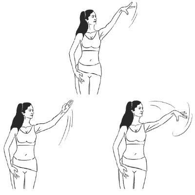 12. Из положения руки возле бедер поднимите правую руку до уровня плеча и выполните волну. Движение начинается от плеча: плечо, запястье, пальцы. Старайтесь, чтобы волны были мягкими, медленными и плавными. Повторите упражнение в другую сторону, общее количество – 30 раз: 15 – правой рукой, 15 – левой.