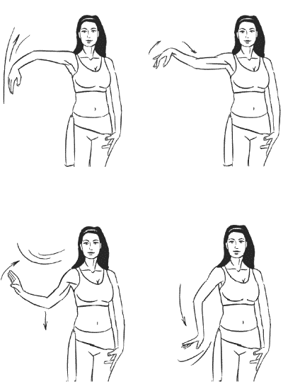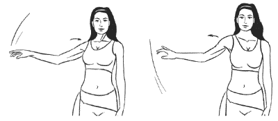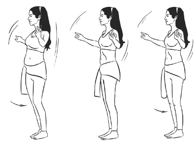 19. Станьте прямо, одна рука свободно опущена вдоль тела, вторая – выпрямлена на уровне плеч. Выполните медленные и плавные удары плечом вперед и назад, как будто ваши плечи похожи на кулаки. Старайтесь, чтобы движения выполнялись только плечом, остальная часть вашего тела должна быть неподвижной. Внимание: плечо вверх не поднимать, удары выполняются только вперед, а не вращаются по кругу. Сочетайте движение с дыханием и музыкой, так вам будет легче удерживать ритм. Поменяйте положение рук и повторите упражнение в другую сторону, общее количество – 30 раз.