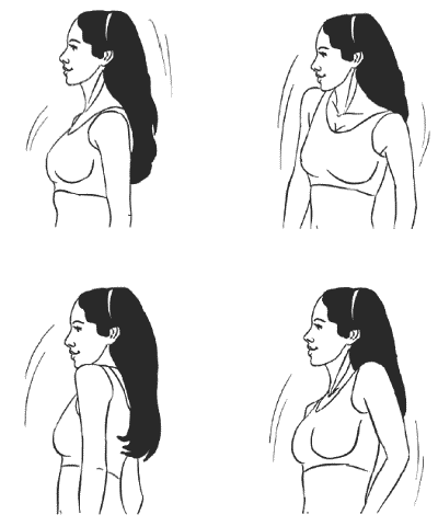 5. Стоя прямо, согните руки в локтях и расположите ладони (соединенные кончиками пальцев) на уровне чуть ниже вашего подбородка. Выполните движение головой вперед-назад, как в восточном танце. Внимание: работают только мышцы шеи, остальная часть тела остается неподвижной. Повторите упражнение на 20–30 счетов.