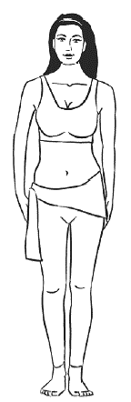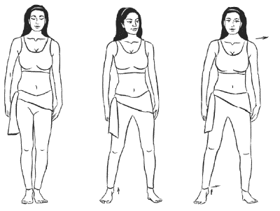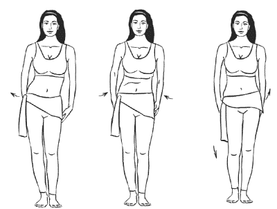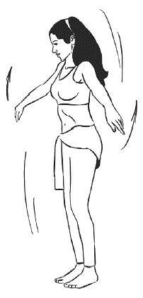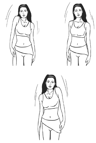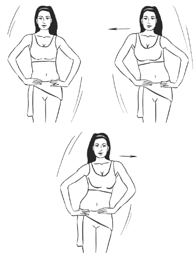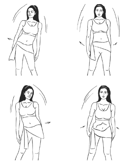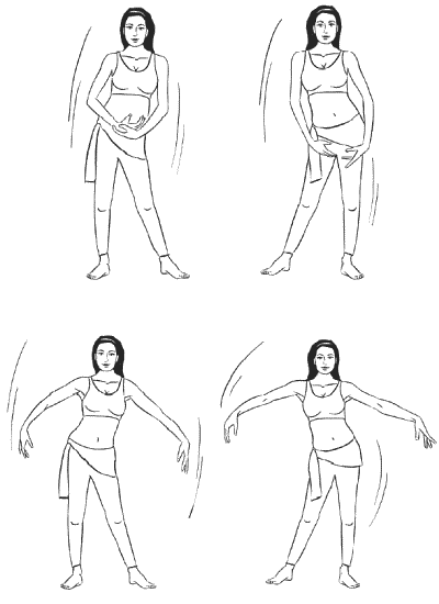 29. Станьте прямо, ноги на ширине бедер, руки свободно расположены вдоль тела. Выполните большие круговые движения бедер, сначала 10 раз на четыре счета: вправо, вперед, влево, назад. Затем выполните непрерывное движение бедер 20 раз на один счет. То же самое повторите в другую сторону, вращая бедра влево, вперед, вправо, назад и непрерывные движения на один счет.