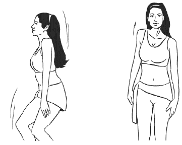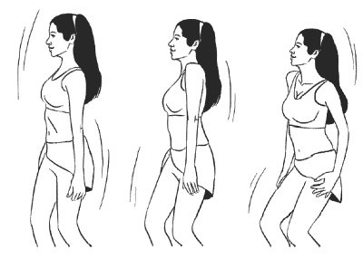 34. Станьте прямо, стопы соединены, колени слегка согнуты, руки выпрямлены на уровне плеч, сохраняя мягкий изгиб в локтях. Перенося вес тела с одной ноги на другую (стопы от пола не отрывать), выполните поочередные толкания бедер вперед – сначала правое, затем левое. Повторите упражнение по 15 раз и ускорьте движение бедер настолько, насколько это для вас возможно. Повторите еще по 10 раз вправо и влево.