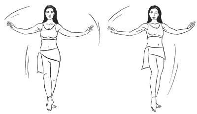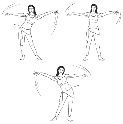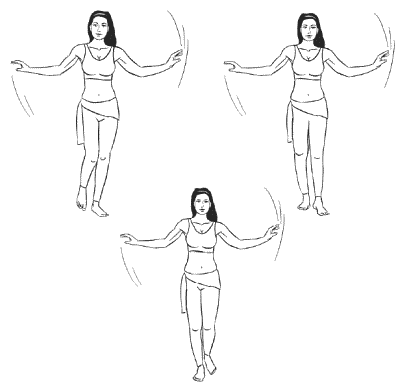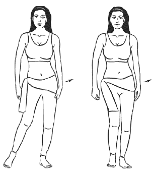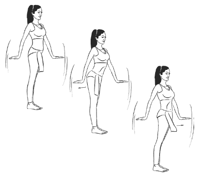 Станьте прямо, стопы на небольшом расстоянии друг от друга, руки расположены на уровне плеч и слегка согнуты в локтях. Вынесите одну ногу вперед; когда большой палец коснется пола выполните вращение бедром вверх и вперед. Верните ногу на место. Затем вынесите вторую ногу вперед и аналогично сделайте вращение бедром. Верните ногу на место. Двигайте бедром, противоположным