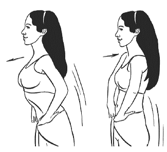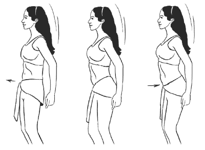 Выполните движение бедер вперед-назад. Ритм следующий: бедра выдвигаем вперед, возвращаемся в вертикальное положение, бедра выдвигаем назад и снова возврат в исходное положение. Старайтесь работать только бедрами, не вовлекая в действие остальную часть тела. Движения вперед выполняйте за счет мышц спины, назад – за счет мышц пресса. Повторите упражнение 30 раз.