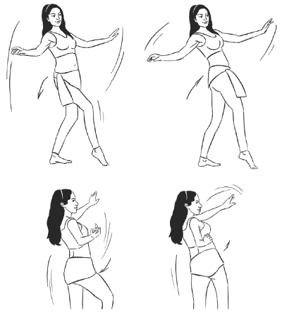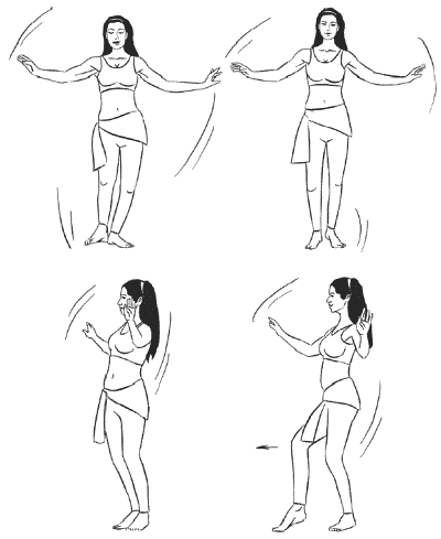37. Данное упражнение является основным движением в танце живота. Это вращение бедер с шагом вперед (именно поэтому оно так подробно нарисовано).