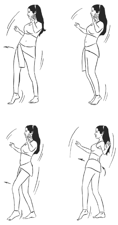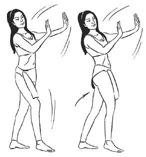 Делая шаг вперед, выполните ритмичное толкание бедра вперед (понятие «шаг» – условно, оно не означает продвижение вперед, вы остаетесь в том положении, которое показано на рисунке, но слегка переносите вес тела вперед и двигаете бедром). Движение следует выполнять на счет «раз».