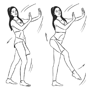 36. Встаньте вполоборота, одна нога полусогнута в колене, расположена перед собой и на носочке. Выполните ритмичное выталкивание бедра вперед, задействуйте колени для выполнения движения. Повторив упражнение 15 раз, максимально увеличьте скорость. Если на начальном этапе вы не можете ускорить покачивание бедра, найдите свой оптимальный ритм. Поменяйте положение тела и повторите упражнение в другую сторону.