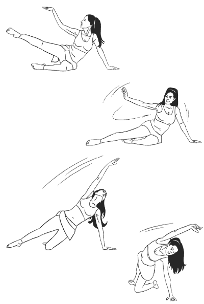41. Сядьте на левое бедро и обопритесь левой рукой о пол. Правая нога и рука вытянуты в сторону, нога касается поверхности, рука на уровне плеч. Сгибая правую ногу в колене, подтяните ее к груди, одновременно согните правую руку и переведите в положение перед грудью, сгруппируйтесь. Выпрямляя руку и ногу, откройтесь, потянувшись за рукой и ногой. Выполните 20 раз. В конце задержите ногу вверху, поверните руку ладонью вверх и зафиксируйте положение на 1 минуту. Опустите ногу и, сделав круг рукой, поднимитесь вверх, опираясь на левое колено и ладонь. Потянитесь корпусом за рукой, почувствовав как растягивается вашего тело. Зафиксируйте положение. Затем поменяйте стороны и повторите упражнение другой ногой и рукой.
