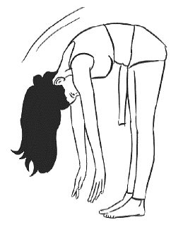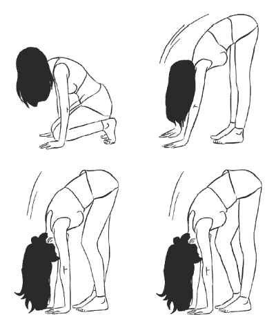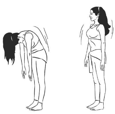44. Из предыдущего положения, медленно разгибайтесь, почувствуйте как позвонок за позвонком выпрямляется ваш позвоночник. Заняв вертикальное положение, стряхните свою усталость и передохните.