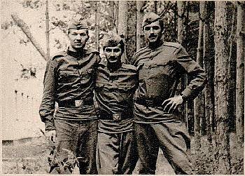 На построении староста нашей группы Виктор Поляков и Володя Бердник были в погонах младших сержантов, Леша Вяльцев красовался с ефрейторской нашивкой, а Витя Прудников стоял навытяжку, ехидно улыбаясь, в солдатских галифе, сандалиях и носках красного цвета. На вопрос местного офицера, что, мол, за вид, он ответил, что у него имеется справка о том, что из-за грибка на ногах ему нельзя носить сапоги, после чего Витю переставили во вторую шеренгу…