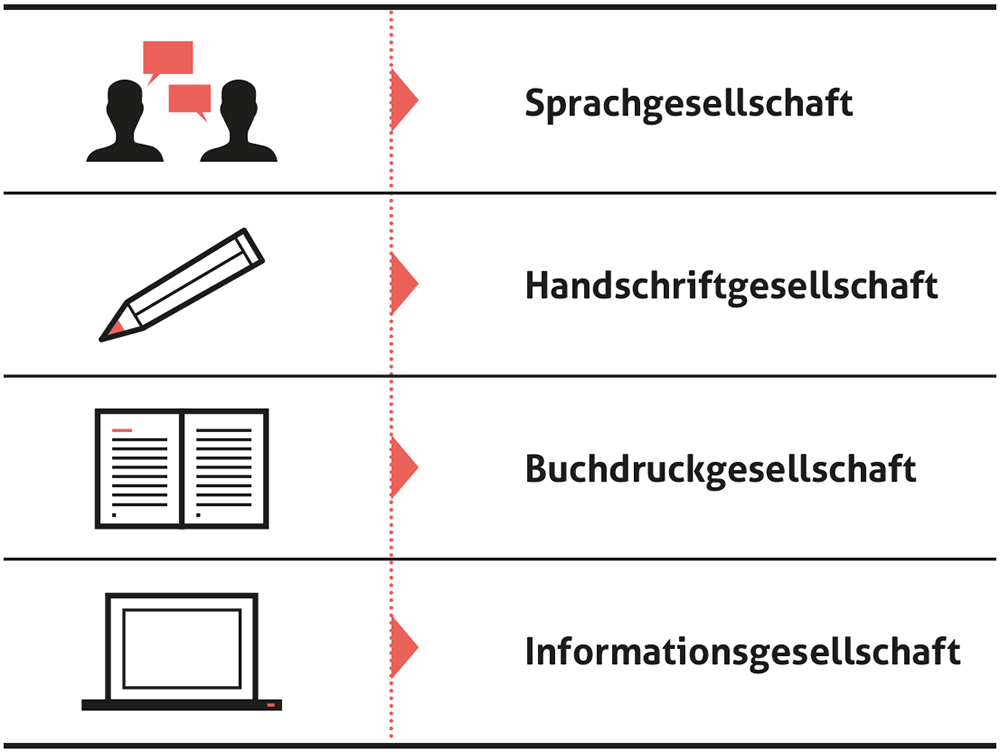 a1133: »Wir haben es mit nichts Geringerem zu tun als mit der Vermutung, dass die Einführung des Computers für die Gesellschaft ebenso dramatische Folgen hat wie zuvor nur die Einführung der Sprache, der Schrift und des Buchdrucks. Die Einführung der Sprache konstituierte die Stammesgesellschaft, die Einführung der Schrift die antike Hochkultur, die Einführung des Buchdrucks die moderne Gesellschaft und die Einführung des Computers die nächste Gesellschaft« (siehe Abbildung 1.4).