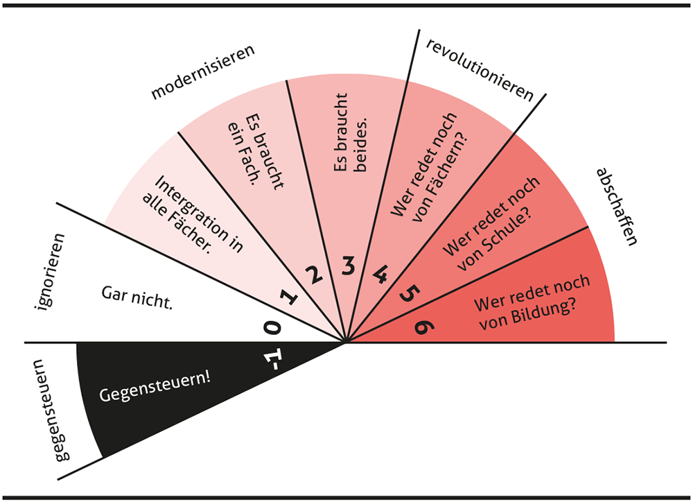Bevor der Autor selbst Stellung bezieht, wird in diesem Kapitel zunächst das gesamte Spektrum aufgezeigt, welche Reaktionsweisen auf den Leitmedienwechsel an Schulen zu beobachten sind. Diese »Leitmedienwechsel-Reaktionsskala« erleichtert einerseits den Überblick über die Debatte. Die Skala kann aber auch ganz konkret in Diskussionen hilfreich sein, um verschiedene Gesprächsbeiträge und Standpunkte einordnen und die dahinterstehenden Positionen voneinander abgrenzen beziehungsweise überhaupt erkennen zu können.