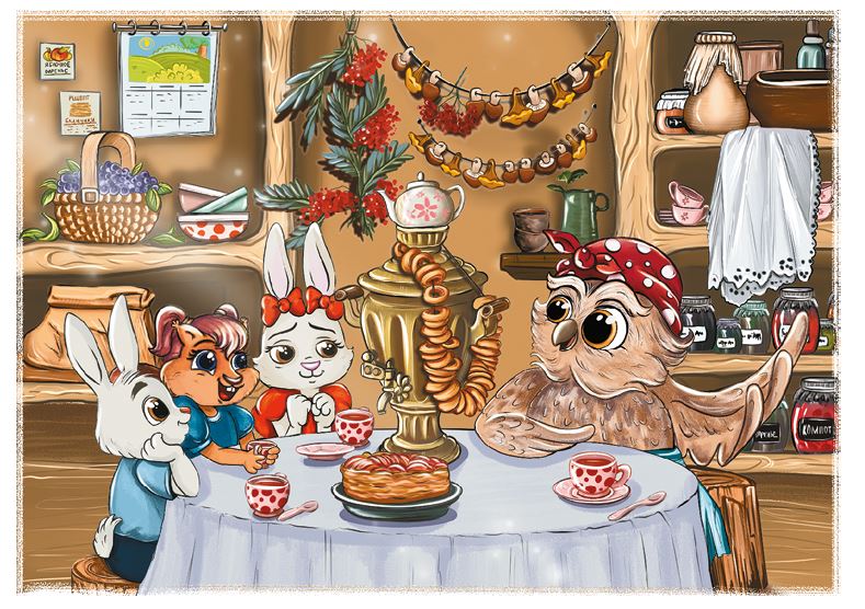 Под вечер друзья отправились в гости к Сове. Они принесли ей запасы еды и ароматный пирог, который испекла мама-белка. Бабушка Сова радостно встретила их и пригласила на чай.