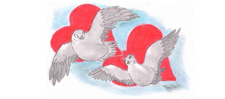 Влюблённые рядышком сидят в ветвях раскидистого дуба: – «Это блаженство! Никто в мире не испытывал такого счастья от соприкосновения клювами… А как она заботливо чистит мои пёрышки…» – нежное воркование пробивается сквозь густую листву могучего дерева.