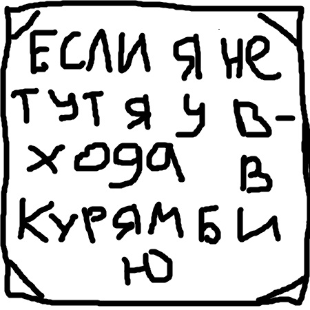 Я уставился на надпись, завис над последним словом. Раскапывал его в своей памяти, но либо ему не хватило в ней ячейки, либо Курямбию с ее входом я никогда не видел. В то, что Курямбия – курятник, в котором курят, я верил с трудом.