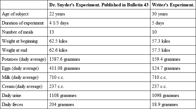 The daily diet of Dr. Snyder's subject consisted of three and one-half pounds of potatoes, eight eggs, a pint and a half of milk, and half a pint of cream. The writer's diet of twelve ounces of solid food (like Luigi Cornaro) consisted of three eggs, the remainder of the twelve ounces in potatoes, and an equal quantity of similar liquid food to that taken by Dr. Snyder's subject. The exercise of the laboratory assistant comprised his daily routine of laboratory work, while that of the writer consisted of six sets of tennis, or an hour and a half on horseback, with an hour to an hour and a half's walk or climb daily, in addition to much reading and writing.