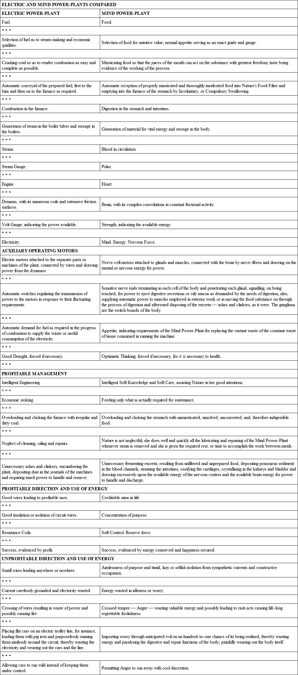 Using an electric power-plant as analogous to the Mind Power-Plant of the brain, and a trolley railroad as analogous to the machinery of the body – analogies which are very close by consistent similarity – the loading of the stomach with unprepared food, as in gluttony, is like loading flat cars with pig iron and running them around the line of the road in place of passenger cars, thereby using up valuable energy and wearing out the equipment without any profit resulting from the expenditure.