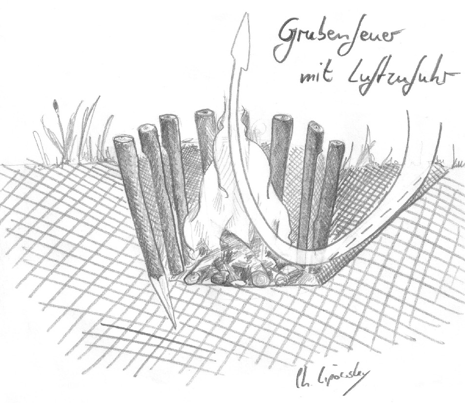 In Windrichtung der Grube legen wir einen Windkanal an, der die Sauerstoffversorgung unseres Feuers sicherstellt und eine unnötige Rauchentwicklung verhindert. Dieser Kanal gleicht einer etwa handbreiten Rampe, die vom Boden der Grube zur Oberfläche verläuft.