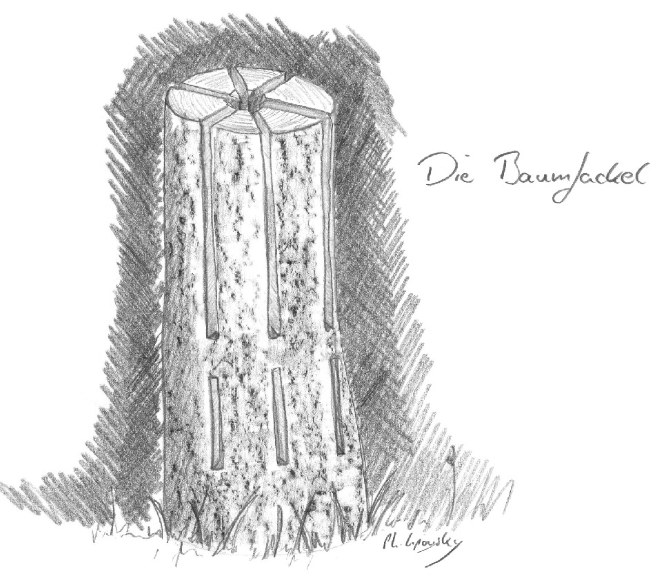 Bei der Baum- oder Schwedenfackel handelt es sich um keine „klassische“ Feuerstelle, sondern um eine Technik, einen Baumstamm zu präparieren und zu entzünden. Baumfackeln erfreuen sich in den letzten Jahren zunehmender Beliebtheit und sind in Miniaturformat fast in jedem Baumarkt zu kaufen. Sie eignen sich nur bedingt zur Zubereitung von Speisen, erzeugen aber schnell eine angenehme, gemütliche Atmosphäre. Ideal ist ihre Verwendung als Wärmequelle im Winter, wenn ein reguläres Feuer im Schmelzwasser der Schneedecke erlöschen würde. Noch einen kleinen Topf Tee, Glühwein oder eine Pfanne Maroni oben drauf gestellt, und wir haben einen gemütlich warmen Pausenplatz während einer Winteraktivität geschaffen. Der Bau einer Baum- oder Schwedenfackel bedarf jedoch eines professionellen Umgangs mit der Motorsäge und ist für Kinder und Jugendliche nicht geeignet! Wir empfehlen daher, die Fackeln bereits im Vorfeld anzufertigen oder anfertigen zu lassen.