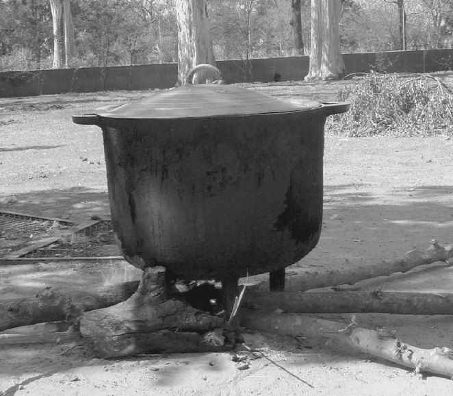Holz so kürzen, dass beim Kochen kein Brennmaterial über den Rand der Grube herausragt