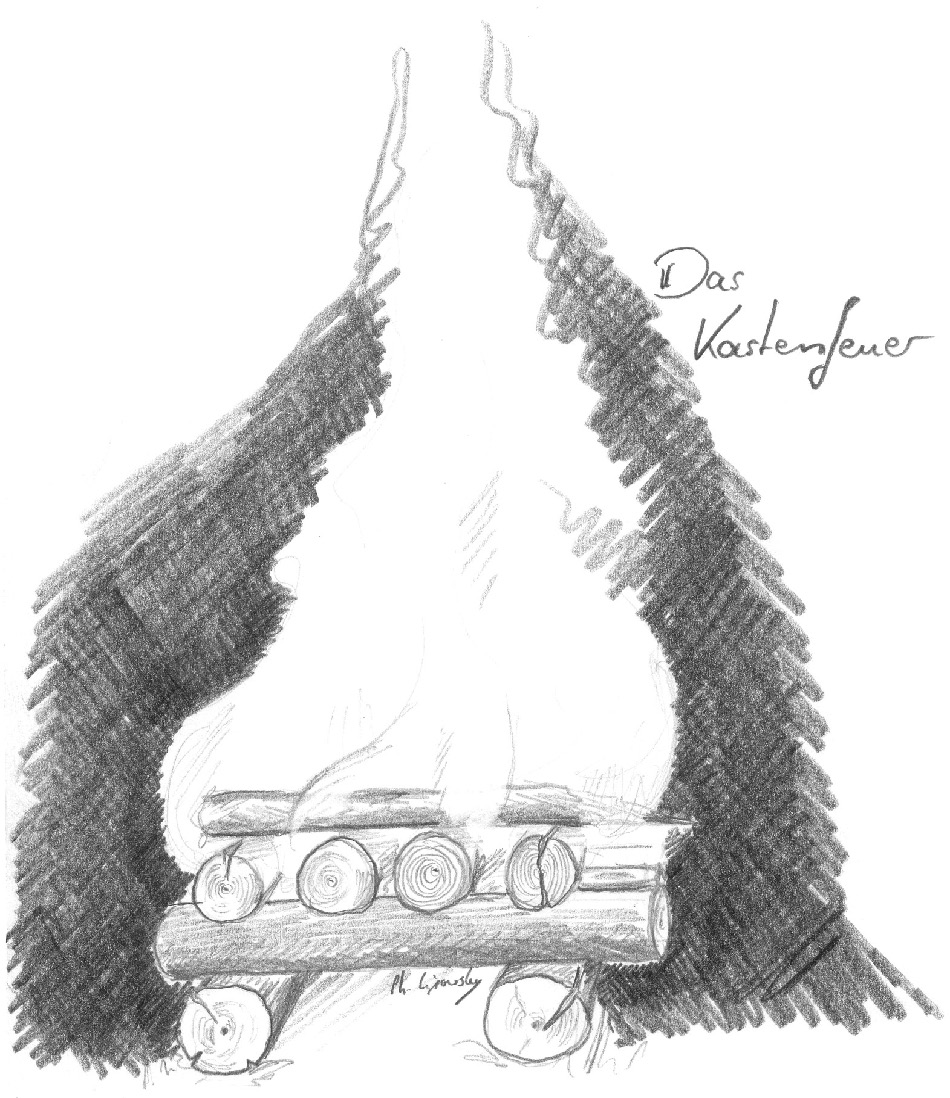 für das Kastenfeuer: 2 große, möglichst feuchte Auflagerhölzer, große Holzscheite aus Nadel- oder Laubholz