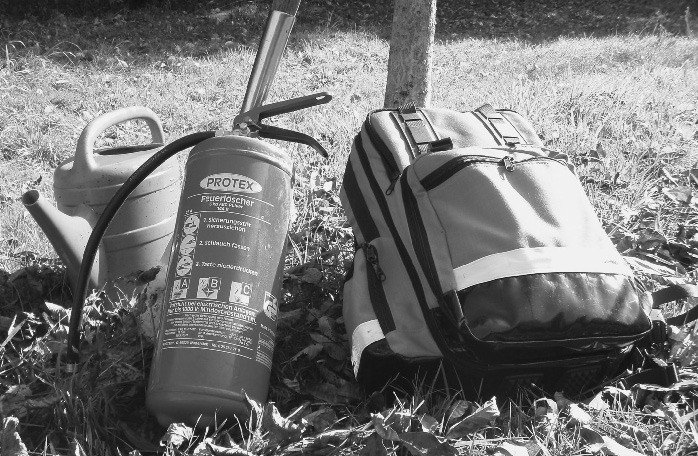 Neben der speziell abgestimmten Erste-Hilfe-Ausrüstung (vgl. Seite 48), sollte man bei der Outdoor-Küche auch stets auf das Löschen außer Kontrolle geratener Feuerstellen vorbereitet sein.