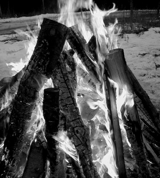 Die Flammen springen üblicherweise zügig auf das Zelt über und das Feuer beginnt sehr heiß und mit hoher Flamme zu brennen. Da das Zelt sehr bald durch die Flammen in sich zusammenstürzen wird (oder seitlich „wegkippt“ – Vorsicht!), ist es wichtig, dass wir bereits im Vorfeld genügend Brennmaterial an die Feuerstelle gebracht haben. Ansonsten beginnt jetzt die Hektik und das eilige Laufen nach Feuerholz!
