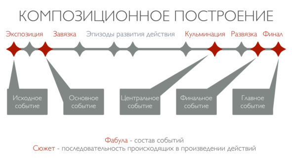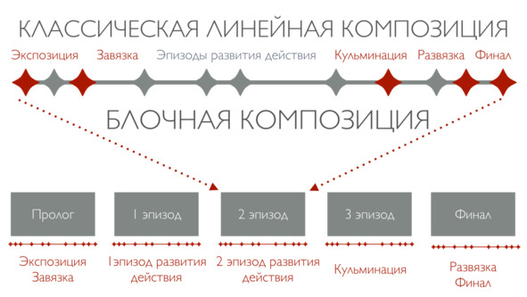Помимо классической композиции, сценарий состоит из блоков (эпизодов), каждый из которых отвечает всем законам композиции и в общей своей совокупности – так же отвечает законам композиции. Пролог, как правило 3 эпизода, Финал. Третий эпизод, как правило – самый сильный, кульминационный.