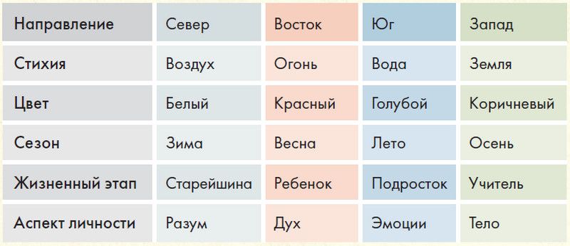 Воздух связан с мыслью и умом. Здесь дуют сильные чистые зимние ветра над бесплодными ландшафтами, и человек может видеть на многие километры над промерзшей землей. Этому квадранту принадлежат интеллект, общение, язык, рассуждения и философия. Цвет этого квадранта – белый или светло-серый, оттенок снега или нежного тумана. Воздух – это царство птиц, среди них огромные хищники, которые в ясный день парят высоко в пустом небе, внимательно глядя вниз. Ястребы и орлы известны своим удивительным зрением и невероятными охотничьими способностями.