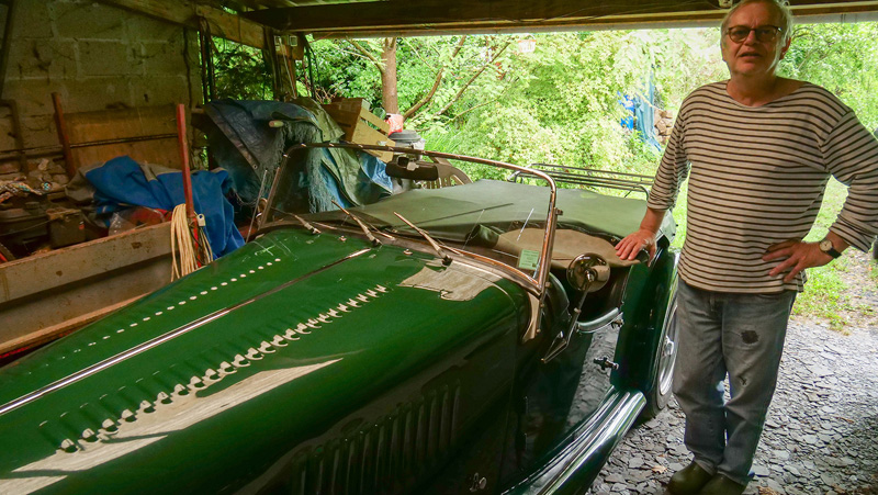 Nachdem ich den besten Kaffee meines Lebens ausgetrunken habe, gehen Jean und ich nach draußen, wo er mir sein Liebhaberstück zeigen möchte. Sorgsam hebt er die Plane an, rollt sie zur Seite, bis ich das Prachtexemplar bewundern kann. Es ist ein Fahrzeug der Morgan Motor Company, britischer Sportwagenhersteller, der im Jahr 1909 von Harry Frederick Stanley Morgan gegründet worden ist. Vor mir glänzt der dunkle Lack des edlen Cabrios, an dessen Seite Jean gern fürs Foto posiert.