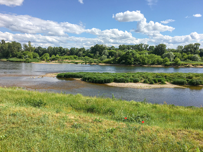 Meine Tagesetappe ist damit kurz und ich lasse es langsam angehen, pausiere auf einer Bank am Loire-Ufer und schaue mir die Wolken an, die sich im Wasser spiegeln, und erfreue mich am üppigen Grün an der Uferlinie, an Sandstränden in der Ferne und der endlich wiedererwachten Sonne, welche ihre Strahlen auf mein Gesicht schickt. Die Inseln, die ich immer wieder in diesem Fluss sehe, gefallen mir besonders, sind sie doch Kennzeichen eines Gewässers, das vom lauten vereinnahmenden Schiffsverkehr glücklicherweise verschont bleibt.