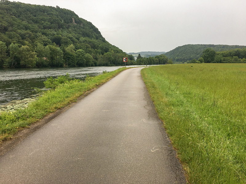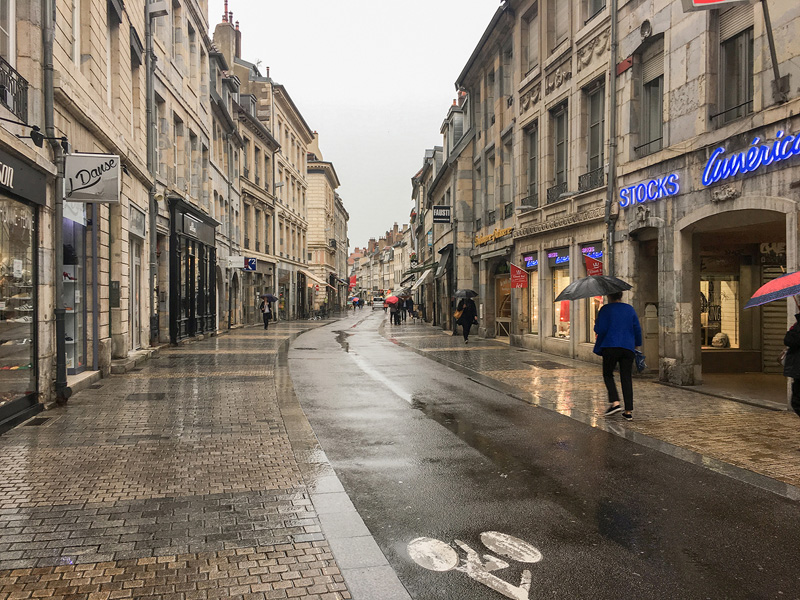An Orten, deren Namen wohlklingen, Rochefort-sur-Nenon und Orchamps, folge ich dem Rhein-Rhône-Kanal, bis der Fluss Le Doubs mein Begleiter nach Besançon wird. Der Ort hat es sich in einer Schleife des Gewässers bequem gemacht und gilt als grünste Stadt Frankreichs. Ich erreiche sie bei strömendem Regen. Das Flusstal, welches ich zuvor passiert habe, hat vom Wetter ja noch profitiert, sah es während einer kleinen Wolkenlücke doch sehr ansehnlich aus, mit weiten saftigen Rasenflächen zwischen dicht bewaldeten Hügeln … Aber hier in der Stadt, in der ich mir nur zitternd schiebend ein, zwei Gässchen anschaue, wird lediglich eine Erinnerung bleiben: grau. Vom natürlichen Wachstum, was der Regen zu verursachen vermag, sehe ich in den Straßen, über denen triefende Wolken hängen, nämlich nichts.