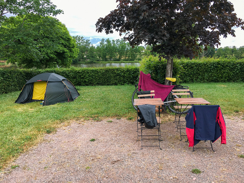 Ich weiß nicht, womit ich das ausgerechnet heute verdient habe, aber bereits gegen halb drei Uhr am Nachmittag steht mein Zelt auf dem wunderschönen Campingplatz an einem See in der Nähe des Örtchens Palinges. Es gibt für Radler extra Parzellen mit Tisch und Stühlen, wunderbar gepflegt für elf Euro, was in den Schnitt passt, den ich bisher für meine Zeltnächte aufgebracht habe. Ja, mit acht bis elf Euro komme ich gut aus, um meine Übernachtungen zu finanzieren.