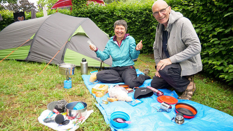 Die hohe Esskultur der Franzosen zeigt sich sogar beim Camping, denn das Essen, was die beiden zaubern, ist um Welten besser als meine traditionelle Pasta, in die ich allabendlich eine andere Sorte Tütensuppe rühre. Hier gibt es Nudelsuppe mit frischem Brokkoli, dazu Brot, Cracker, Obst. Mein Magen freut sich über die hochwertigen Zutaten, mehr jedoch noch über die liebenswerte Gesellschaft. Während Claudine herrlich mitreißend lacht, ist Didier eher der Typ stiller Schmunzler, mit Augen, die sich mit ihm und der Welt freuen. Claudines Persönlichkeit wird von ihren frechen kurzen Haaren und der sportlichen Figur, die in einer langärmligen karierten Outdoorbluse sowie einer Funktionshose steckt, unterstrichen. Didier ist groß und drahtig, hat eine Glatze und auf seiner Nase sitzt eine Brille mit schmalem dunklem Rand, über Kinn und Wangen verteilen sich weiße Bartstoppeln. Das Bild dieser beiden Menschen auf der großen Camping-Plane, die zugleich Buffettafel ist, ist herrlich. Fröhlich schlemmen die Eheleute und bieten mir immer wieder von ihrem leckeren Brot an. Wir kommen ins Philosophieren darüber, wie gut wir es doch alle gerade haben – in herzlicher Gesellschaft, an der frischen Luft und der gleichsam reichhaltigen sowie schmackhaften Nahrung.