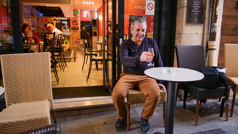 „Oui, bien sûr!“, erwidert mein Gesprächspartner überzeugt. Schon seit dreißig Jahren verkauft der Gastronom Wein, die meiste Zeit davon hatte er eine Bar im noch stärker touristisch erschlossenen Bereich dieser Stadt, erst seit einigen Jahren arbeitet er an diesem Standort. Hier gefällt es ihm besser, weil es familiärer zugeht. Immer wieder grüßen ihn die Vorbeikommenden oder bleiben auf einen Schwatz stehen. Ich sehe mir meinen Gesprächspartner genauer an und stelle mir eine Frage, die mich in diesen Tagen schon öfters beschäftigt hat: Wie nur schaffen es die Franzosen, so oft ausgesprochen adrett zu wirken? Der Wirt trägt eine schlichte braune Hose zu schwarzen Turnschuhen und ein dunkles Langarmshirt mit zarten hellen Streifen. Obwohl seine Frisur nicht außergewöhnlich ist, so wirkt dieser Mann chic. Ja, viele Franzosen haben etwas an sich, was ihnen Eleganz verleiht, vielleicht tut die nobel klingende Sprache ihr Übriges. Von den sorgsam geschminkten anmutigen Frauen ganz zu schweigen …