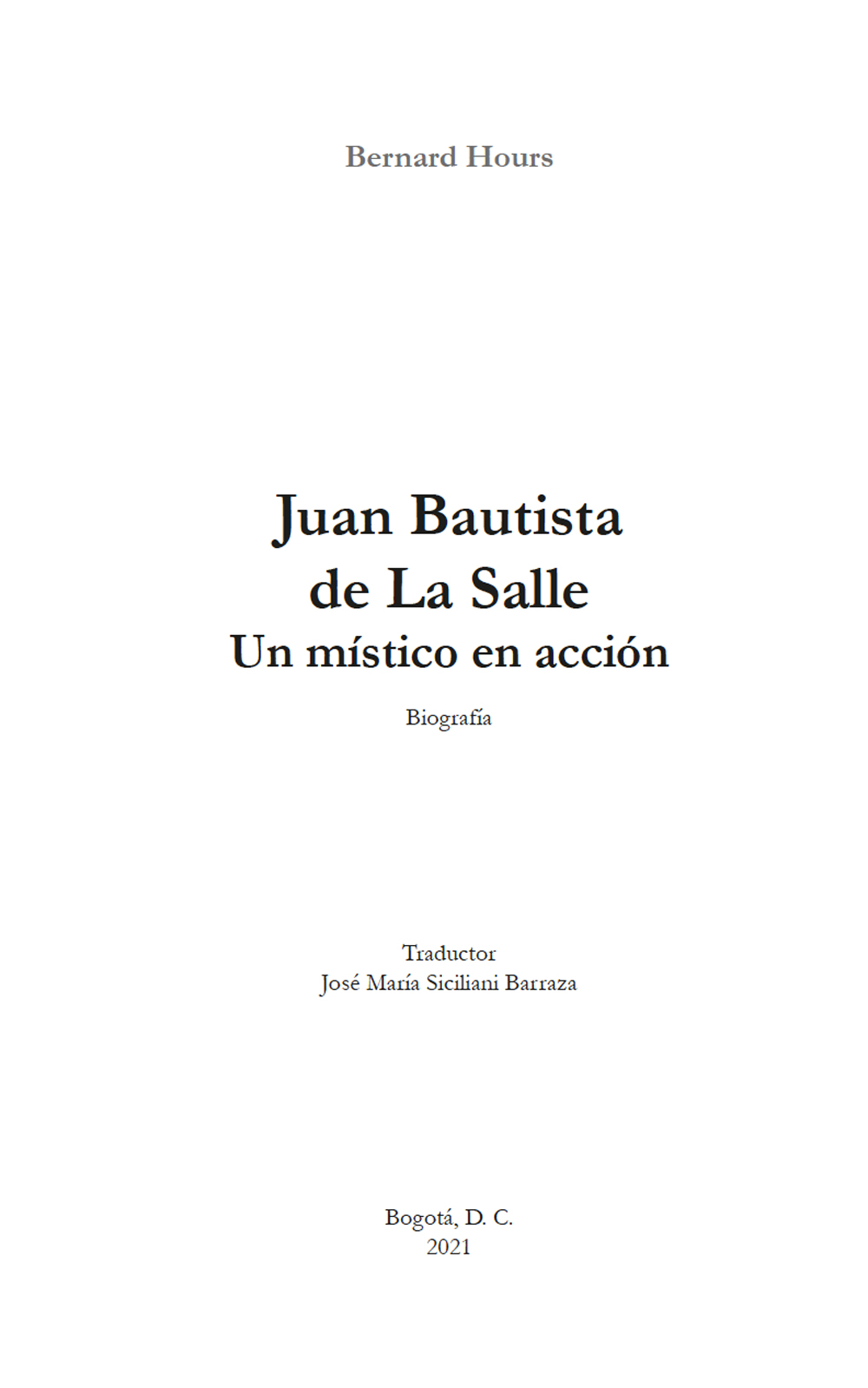 Juan Bautista de La Salle : un místico en acción. Biografía / Bernard Hours ; traductor: José María Siciliani Barraza. - Primera edición. - Bogotá : Universidad de La Salle, 2021.