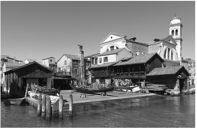 В Венеции пешеходы и грузовой транспорт перемещаются по совершенно отдельным, накладывающимися системам. Очевидно, что эти два наложенных друг на друга способа коммуникации не развивались совершенно независимо. Каждый рынок должен был иметь как сухопутный, так и водный доступ. На карте де’ Барбари мы видим, что Кампо Сан-Поло, где располагался один из двух главных еженедельных рынков города (второй находился на площади Сан-Марко), первоначально имел канал вдоль своей изогнутой стороны для транспортировки товаров на рынок. Аналогично, каждый важный дворец должен был иметь доступ к воде, а также вход с улицы. Причал на канале был необходим для доставки продовольствия и топлива, а также для погрузки и разгрузки товаров, если владелец занимался торговлей. До XIX в. богатые семьи владели как минимум одной гондолой для собственного пользования, а также небольшими плоскодонными лодками «сандоли» для перевозки товаров. Их привязывали к характерно украшенным деревянным причальным столбам перед дворцами. Хотя в Венеции и могло быть несколько лошадей, венецианский дворец, очевидно, не нуждался в конюшнях; и в Венеции лодочные верфи, или squeri, заняли место каретников в материковых городах. Верховая езда на Мерчерии была запрещена в 1297 г.; после этого всадники привязывали своих лошадей к фиговому дереву в конце улицы Риальто.