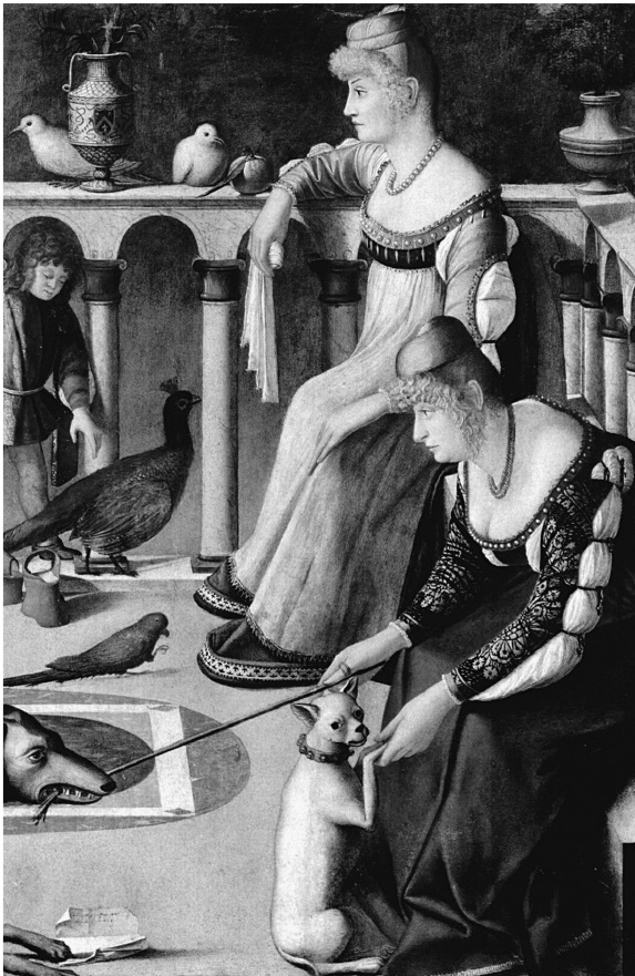 Витторе Карпаччо, Две венецианки, около 1495 г. (Музей Коррер, Венеция). На этой картине, которая теперь известна как нижняя часть панно «Охота в лагуне» (Музей Гетти, Лос-Анджелес), изображены две благородные дамы, развлекающиеся на альтане (балконе)