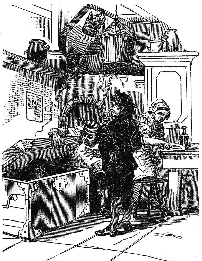 Дьячок вышел оттуда и, столкнув сундук в воду, повел Клауса к себе и отсыпал ему лукошко серебра.