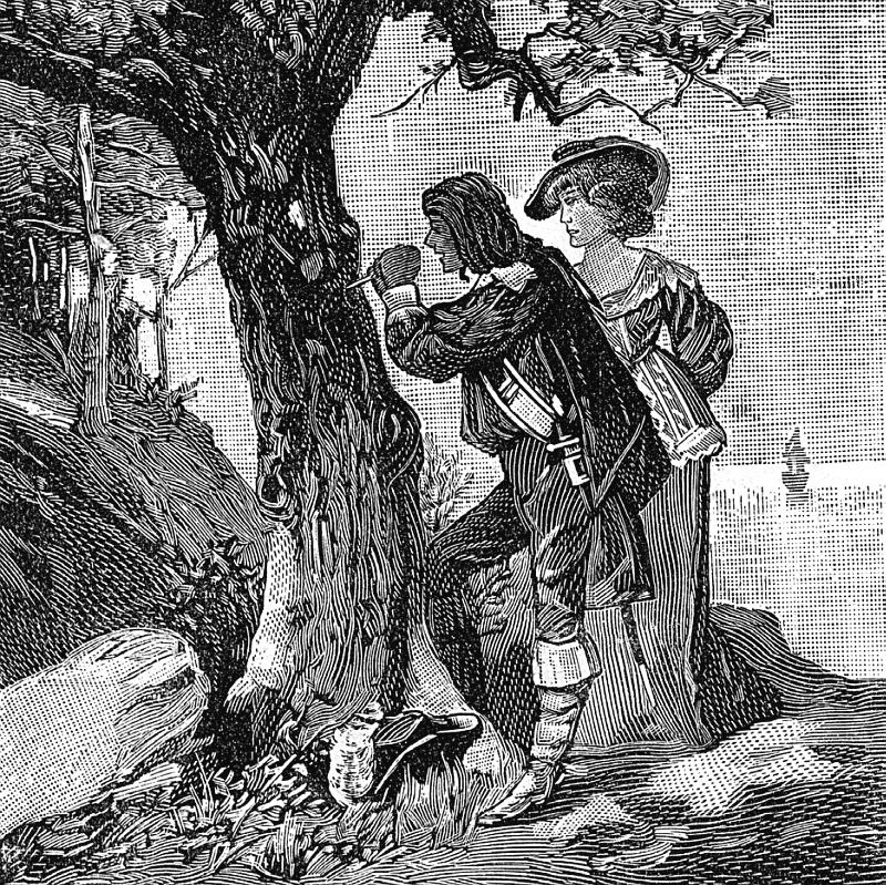 Снится дубу, что время праздничное; чудится ему звон колоколов, но вместе с тем кажется, что надворе не зима, а ясный, теплый летний день. Широко раскинулась его зеленая макушка. Сквозь развесистые сучья прорываются солнечные лучи и играют на листьях и траве, чудный запах трав и цветов наполняет воздух, пестрые бабочки гоняются друг за другом, мухи-поденки веселятся и пляшут, словно весь мир создан лишь для их радости и утехи. Все, что пережил дуб за свою долгую жизнь, что видел вокруг себя, проходило теперь перед ним в торжественном шествии. Вот едут верхом на статных конях благородные рыцари и дамы; на шляпах у них развеваются перья, у каждого всадника, у каждой дамы сидит на руке, затянутой в перчатку, сокол; звучат охотничьи рога, лают собаки. А вот идет неприятельская рать в блестящих латах, с копьями и алебардами.