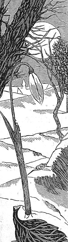 И стал цветок наверх пробираться. Скоро из-под снега показался стебелек с бледно-зеленым бутоном; его плотно облегали узенькие, толстенькие листочки. От дождя и теплого ветра снег так обрыхлел, что пробираться сквозь него цветку было нетрудно.