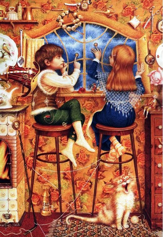 Зимою это удовольствие прекращалось, окна зачастую покрывались ледяными узорами. Но дети нагревали на печке медные монеты и прикладывали их к замёрзшим стёклам – сейчас же оттаивало чудесное кругленькое отверстие, а в него выглядывал весёлый, ласковый глазок, – это смотрели, каждый из своего окна, мальчик и девочка, Кай и