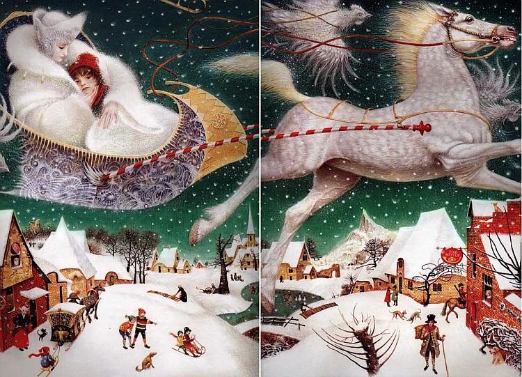 На площади каталось множество детей. Те, что были посмелее, привязывали свои санки к крестьянским саням и уезжали таким образом довольна далеко. Веселье так и кипело. В самый разгар его на площади появились большие сани, выкрашенные в белый цвет. В них сидел человек, весь ушедший в белую меховую шубу и такую же шапку. Сани объехали кругом площади два раза: Кай живо привязал к ним свои санки и покатил.