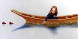 Лодку уносило все дальше; Герда сидела смирно, в одних чулках; красные башмачки её плыли за лодкой, но не могли догнать её.