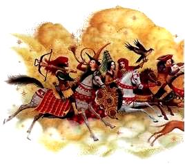 – А мне кажется, кто-то идёт за нами! – сказала Герда, и в ту же минуту мимо неё с лёгким шумом промчались какие-то тени: лошади с развевающимися гривами и тонкими ногами, охотники, дамы и кавалеры верхами.