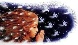 Герда начала читать «Отче наш»; было так холодно, что дыхание девочки сейчас же превращалось в густой туман. Туман этот все сгущался и сгущался, но вот из него начали выделяться маленькие, светлые ангелочки, которые, ступив на землю, вырастали в больших грозных ангелов со шлемами на головах и копьями и щитами в руках. Число их все прибывало, и когда Герда окончила молитву, вокруг неё образовался уже целый легион. Ангелы приняли снежных страшилищ на копья, и те рассыпались на тысячи снежинок. Герда могла теперь смело идти вперёд; ангелы гладили её руки и ноги, и ей не было уже так холодно. Наконец девочка добралась до чертогов Снежной королевы.