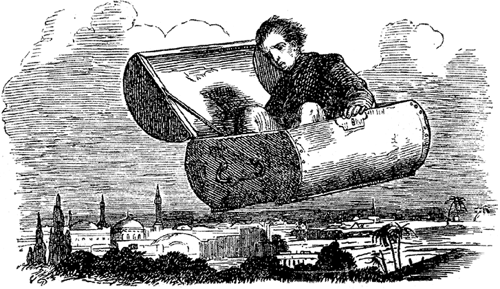 А сундук-то был непростой. Стоило нажать замок – и сундук взвивался в воздух. Купеческий сын так и сделал. Фьють! – сундук вылетел с ним в трубу и понесся высоко-высоко, под самыми облаками, – только дно потрескивало! Купеческий сын поэтому крепко побаивался, что вот-вот сундук разлетится вдребезги: славный прыжок пришлось бы тогда совершить ему! Боже упаси! Но вот он прилетел в Турцию, зарыл свой сундук в лесу в кучу сухих листьев, а сам отправился в город – тут ему было нечего стесняться своего наряда: в Турции все ведь ходят в халатах и туфлях.