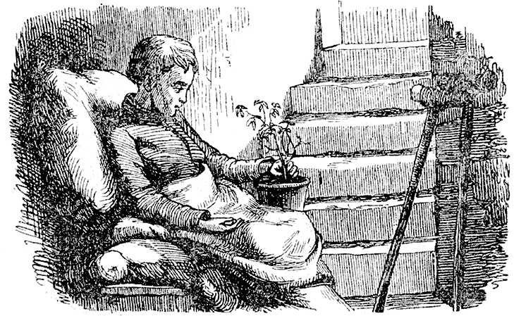 – В этой узкой улице, в низком подвале, жил бедный больной мальчик. С самых ранних лет он вечно лежал в постели; когда же чувствовал себя особенно хорошо, то проходил на костылях по своей каморке раза два взад и вперед, вот и все. Иногда летом солнышко заглядывало на полчаса и в подвал; тогда мальчик садился на солнышке и, держа руки против света, любовался, как просвечивает в его тонких пальцах алая кровь; такое сидение на солнышке заменяло ему прогулку. О богатом весеннем уборе лесов он знал только потому, что сын соседа приносил ему весною первую распустившуюся буковую веточку; бедняжка держал ее над головой и переносился мыслью под зеленые буки, где сияло солнышко и распевали птички. Раз сын соседа принес мальчику и полевых цветов, между ними был один с корнем; мальчик посадил его в цветочный горшок и поставил на окно близ своей кроватки. Видно, легкая рука посадила цветок: он принялся, стал расти, пускать новые отростки, каждый год цвел и был для мальчика целым садом, его маленьким земным сокровищем. Мальчик поливал его, ухаживал за ним и заботился о том, чтобы его не миновал ни один луч, который только пробирался в каморку. Ребенок жил и дышал своим любимцем, ведь тот цвел, благоухал и хорошел для него одного. К цветку повернулся мальчик даже в ту последнюю минуту, когда его отзывал к себе Господь Бог… Вот уже целый год, как мальчик у Бога; целый год стоял цветок, всеми забытый, на окне, завял, засох и был выброшен на улицу вместе с прочим хламом. Этот-то бедный, увядший цветочек мы и взяли с собой: он доставил куда больше радости, чем самый пышный цветок в саду королевы.
