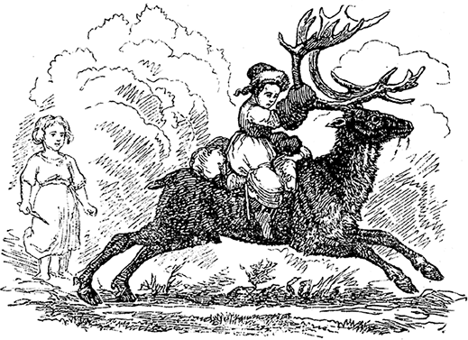 Северный олень подпрыгнул от радости. Маленькая разбойница подсадила на него Герду, крепко привязала ее, ради осторожности, и подсунула под нее мягкую подушечку, чтобы ей удобнее было сидеть.