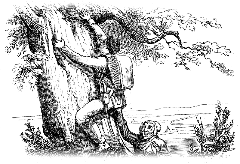 – Видишь вон то старое дерево? – сказала ведьма, показывая на дерево, которое стояло неподалеку. – Оно пустое внутри. Влезь наверх, там будет дупло, ты и спустись в него, в самый низ! А я обвяжу тебя веревкой вокруг пояса и вытащу назад, когда ты мне крикнешь.